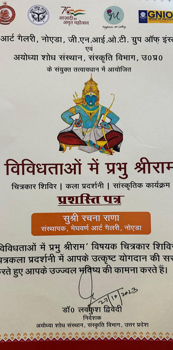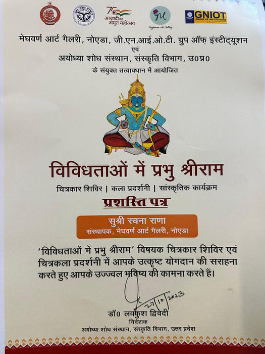 Art Exhibition based on Life Journey of Lord Rama titled Vividhtao me Prabhu Ram. This exhibition was done in association with Ayodhya Sodh Sansthan, Department of Culture Governemnt of UP and GNIOT group of Institutions. This exhibition is based on Life journey of Lord Rama, It's relevance for entire humanity. In this exhibition many Artists from various states of our country showcase their artworks which was appreciated by UP Government.